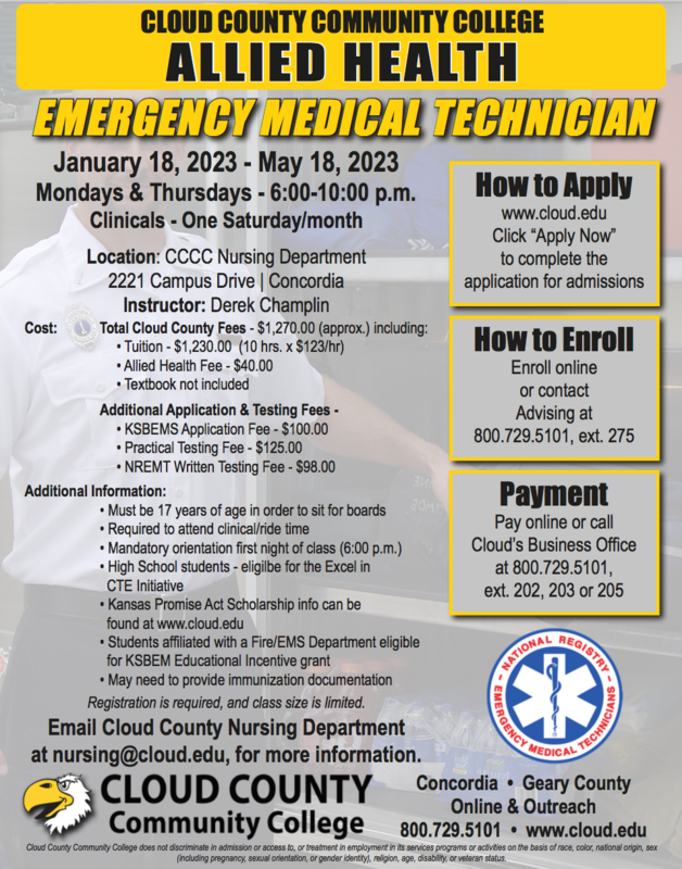 Attached is the EMT class available in Concordia - CCCC for Spring 2023.