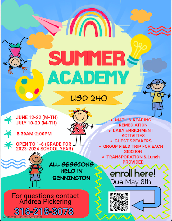 Twin Valley USD 240 will be holding Summer Academy June 12-22 (M-TH) and July 10-20 (M-TH). Summer Academy is open to Tescott and Bennington students who will be in 1st - 6th grade (determined by the grade for the 2023- 2024 school year). All sessions will be held in Bennington. Don't miss the enrollment deadline of May 8.